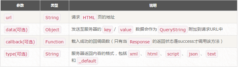 • 它与$.get()方法的结构和使用方式相同,有如下区别
